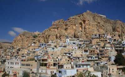 Ma’alula means the entrance in the Aramic language. It is a rocky village located in the middle of the Syrian countryside, nestled in the Qalamoun mountains 1500 meters above sea level, Maaloula is one of the most scenic villages in Syria, up till now it’s people still speak Aramic, the language of Jesus Christ . It is historically the home of the First Martyr, St Takla, daughter of a Roman prince who was converted to Christianity by St Paul. The story goes that after St Takla’s pagan father learned of her conversion, he sent his soldiers to execute her but each time she was miraculously saved. Fleeing to Syria, St Takla found herself confronted by the impassable Qalamoun mountains. After praying to God to save her, the mountain was miraculously split in half so she could escape her persecutors.