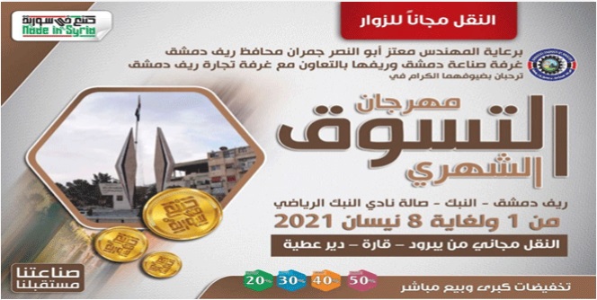 Damascus (ST): The Damascus Chamber of Industry and its Countryside, in cooperation with the Damascus Countryside Chamber of Commerce, will launch the 116th edition of the monthly shopping festival “Made in Syria” tomorrow in the Al Nabek Sports Club hall, with the participation of more than a hundred local industrial companies.