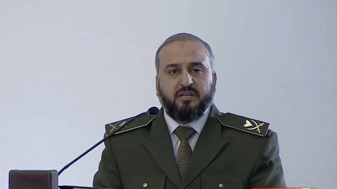 Major General Marhaf Abu Qasra delivers his speech as Minister of Defense in the new Syrian government