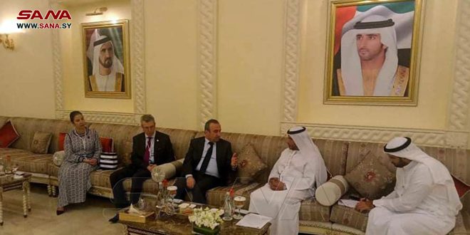 DUBAI, Sep.29, (ST)-Within the activities of the World Green Economy Summit, which is being held in Dubai with the participation of Syria, the Minister of Local Administration and Environment, Hussein Makhlouf, discussed with the Director of the World Green Economy Organization Abdul Rahim Sultan, the measures taken by the Syrian state to protect and preserve the environment, and the harm inflicted upon it as a result of the terrorism it was exposed to during the past years.