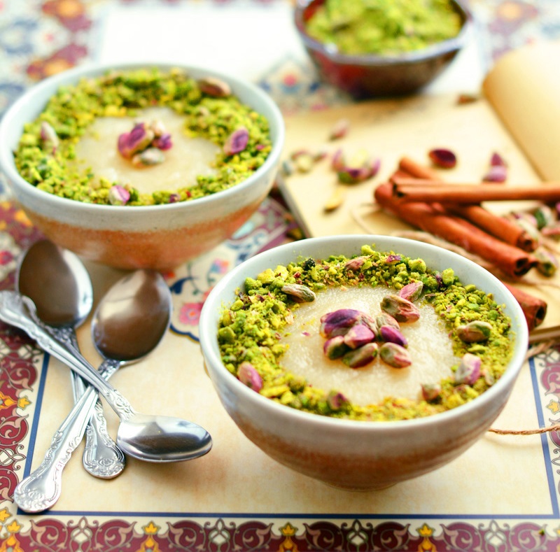 Mamounieh is an ancient dessert originating in Aleppo, Syria. It is traditionally eaten as breakfast food,in weddings and special occasions.