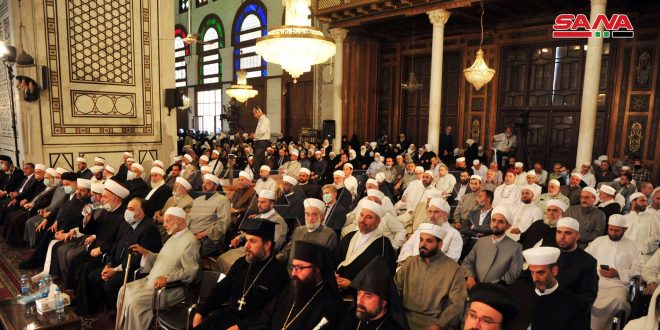 The Grand Ummayad Mosque in Damascus on Monday hosted a massive gathering for Moslem scholars and Christian clergymen in support for holding presidential elections in Syria scheduled on Wednesday, May 26th, 2021 and for maintaining the unity of Syrian national fabric.