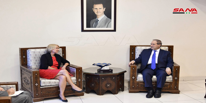 DAMASCUS, (ST)- The Syrian state has exerted great efforts to demine the areas which have been liberated from terrorists who, before their defeat planted mines and explosive devices everywhere in order to kill as many civilians as possible, Deputy Minister of Foreign Affairs and Expatriates Faysal al-Mikdad said during his meeting on Monday with Director of the United Nations Mine Action Service (UNMAS) Agnes Marcaillou.