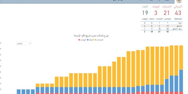 The new service showed that the registered cases of Coronavirus in Syria amounted to 43 cases, 19 of which recovered , three cases died. The cases were distributed among the governorates of Daraa, one case, Damascus 12 : 8 cases recovered and two cases died and two are under treatment, and Damascus Countryside: 30 cases, 11 cases recovered, one case died, and 18 cases are under treatment.