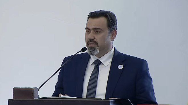 Mohammad Abdul Rahman Turko delivers his speech as Minister of Education in the new Syrian government.