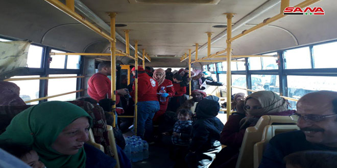 Several buses, ensured by the Syrian state, transferred the families from Jleigim corridor to makeshift centers in Homs in preparation to transfer them to their original areas of residence which have been liberated from terrorism by the Syrian Arab army.
