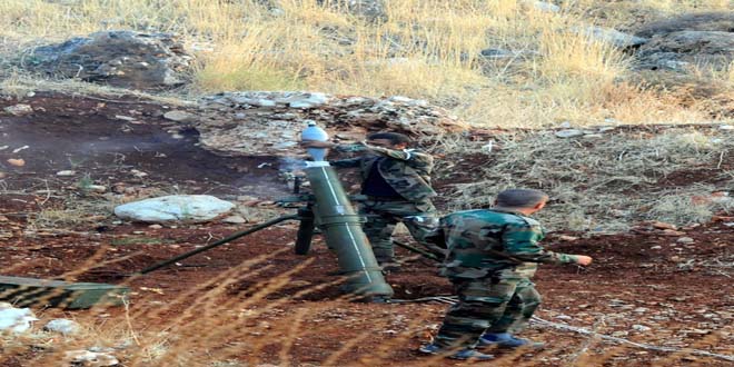 Dens and gatherings of “Jabhat al-Nusra”, “Islamic Union of Ahrara al-Sham” and “Jaish al-Nassr” were destroyed during the sorties in al-Tamaniaa, al-Latamina, Marit Harma, al-Tah, al-Habit, Skik and Kafr Zita in the northern countryside of Hama.