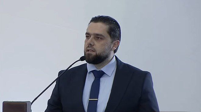 Mustafa Abdul Razzaq delivers his speech as Minister of Public Works and Housing in the new Syrian government