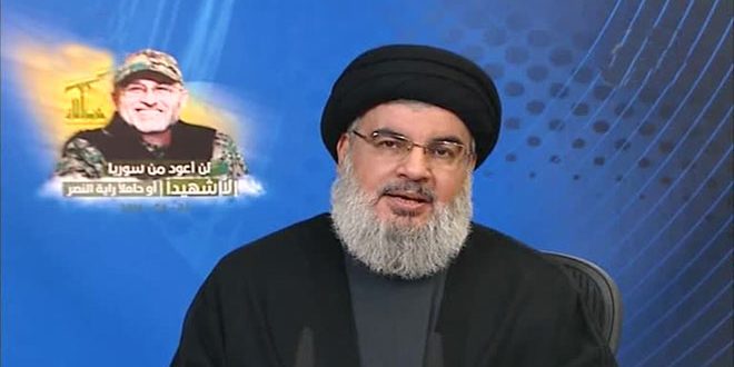 BEIRUT, (ST)- The participation of the Lebanese resistance in the war on terrorism in Syria aims, beside at supporting the Syrian army against takfiri terrorists, at defending Lebanon, because Lebanon’s future and destiny can’t be separated from what is going on in Syria, Hizbollah Secretary General Hasan Nasrallah said in a speech on Friday marking 40 days after the martyrdom of Hizbollah commander Mustafa Badreddine in a terrorist attack in Syria.