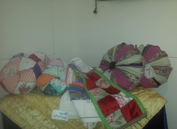 The exhibition displays wonderful works such as: covers , cushions and decorative panels. These works were made by 20 women, who had started their works since the start of the crisis in Syria [in 2011] with the aim of filling their free time and doing something useful through reviving heritage products and the habits of our grandmothers and mothers and reusing damaged material to do beautiful things that fit modern age.