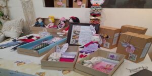 Jumana Malal displayed handmade wool products as scarves, hats, small toys, key chains, and other things for social occasions.