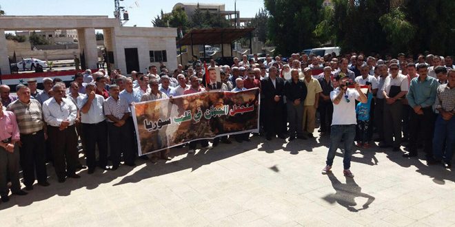 QUNEITRA, (ST)- The occupied Syrian Golan will continue to be a Syrian Arab land and that the Golan will return to the Syrian national sovereignty sooner or later, the people of Quneitra stressed during a protest they organized on Sunday to condemn the Israeli occupation’s illegal decision to hold the so-called “local councils” elections in the occupied Syrian Golan.