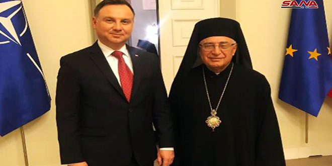 During his meeting on Friday with President of Poland Andrzej Duda at the Presidential Palace in Warsaw, Patriarch al-Absi said the unilateral coercive measures on Syria should be lifted as they badly affect the living of the Syrian people in the first place. He also urged Poland to play a role in solving the crisis in Syria.