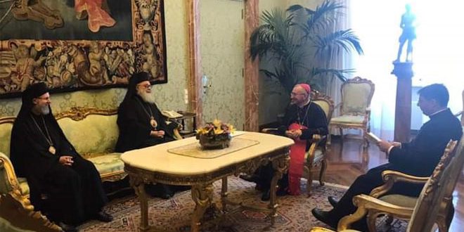 During his meeting on Saturday with the Vatican’s Secretary of State Cardinal Pietro Parolin at the Holy See’s palace, Patriarch Yazigi urged intensifying collective efforts as to lift the American and European sanctions imposed on Syria and affecting the livelihood of the Syrian citizens.