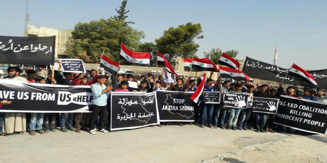 ALEPPO, (ST)-The people of Al-Sfeira city in Aleppo eastern countryside organized a rally to protest the massacres committed by the US-led International coalition against the Syrians and which have claimed the lives of hundreds of civilians in the Syrian provinces of Raqq, Aleppo, Hassaka and Deir Ezzor.