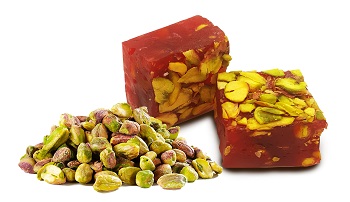 Malban also known as (halvan or Raha), it is kind of gummy or jello candy that is sometimes served with nuts – hazelnuts, walnuts or pistachio and sometimes you can find it in white color or flavored. It is a paste made of sugar and wheat starch, a delicacy very well known among Syrian confectioneries especially in Moulid events (birth of Prophet Mouhamad) .