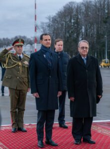 The Syrian and Russian national anthems were played, and President Al-Assad reviewed the guard of honor.