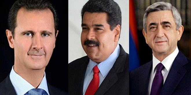 DAMASCUS, (ST)-President Bashar Al-Assad continued on Monday to receive congratulations on Syria’s 71st Independence Day and this time from President Nicolas Maduro of the Bolivarian Republic of Venezuela and from Armenia’s President Serzh Sargsyan.