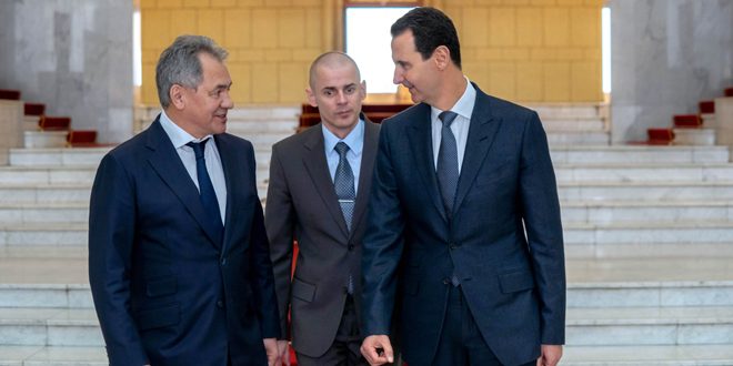 President Al-Assad was speaking during his meeting on Tuesday with Russia’s Defense Minister Sergey Shoigu, who affirmed his country’s determination to continue the fight against terrorism alongside the Syrian Arab Army in order to complete the liberation of the Syrian territories from terrorism and to maintain Syria’s sovereignty, independence and territorial integrity.