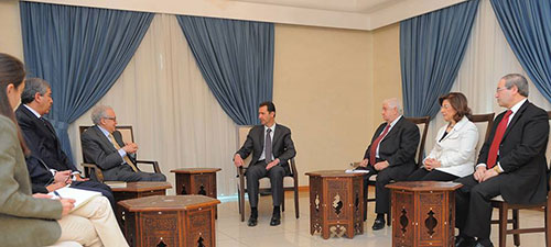 President Al-Assad was speaking to the UN Syria Envoy Lakhdar Brahimi during a meeting on Wednesday. He was briefed by Brahimi on the results of his tour in a number of countries in the region within the framework of the ongoing preparations to hold the International Conference on Syria in Geneva.