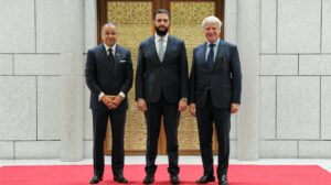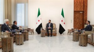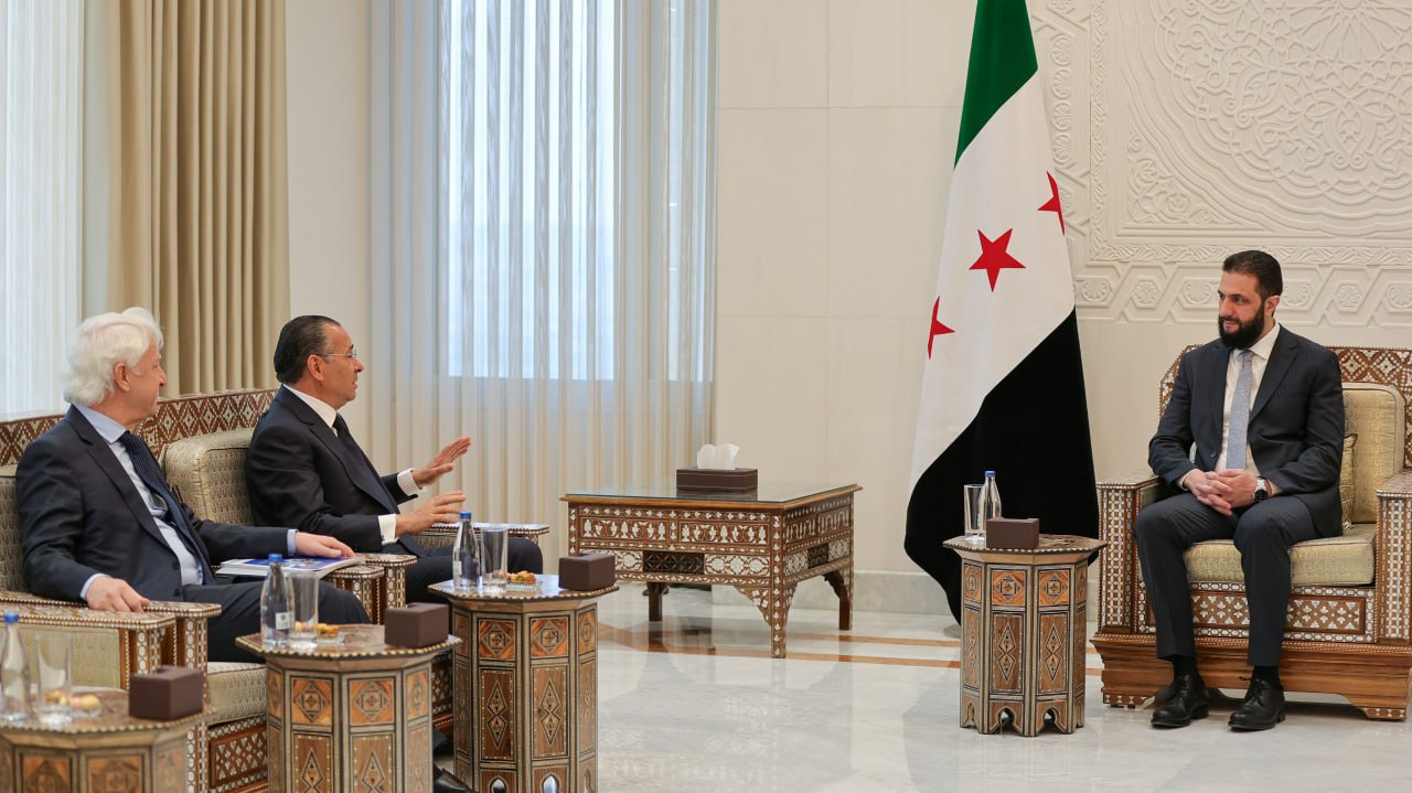 The president of the Republic, Mr. Ahmed Al-Sharaa, and the Minister of Foreign Affairs, Mr. Asaad Al-Shaibani, received at the People’s Palace Dr. Kamal Gharibi, chairman of GKSD Investment Holding Group and chairman of the San Donato Hospitals Group of the Scientific Institute for Research, Investment and Healthcare, along with his Special Adviser, Dr. Tammam Youssef.