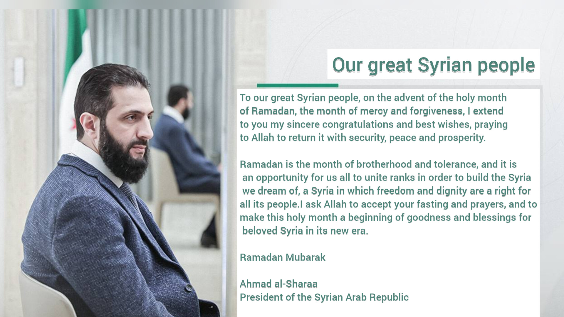 DAMASCUS, Mar.1, (ST)- The President of the Syrian Arab Republic, Mr. Ahmad Al-Shara, congratulated the Syrian people on the advent of the holy month of Ramadan.