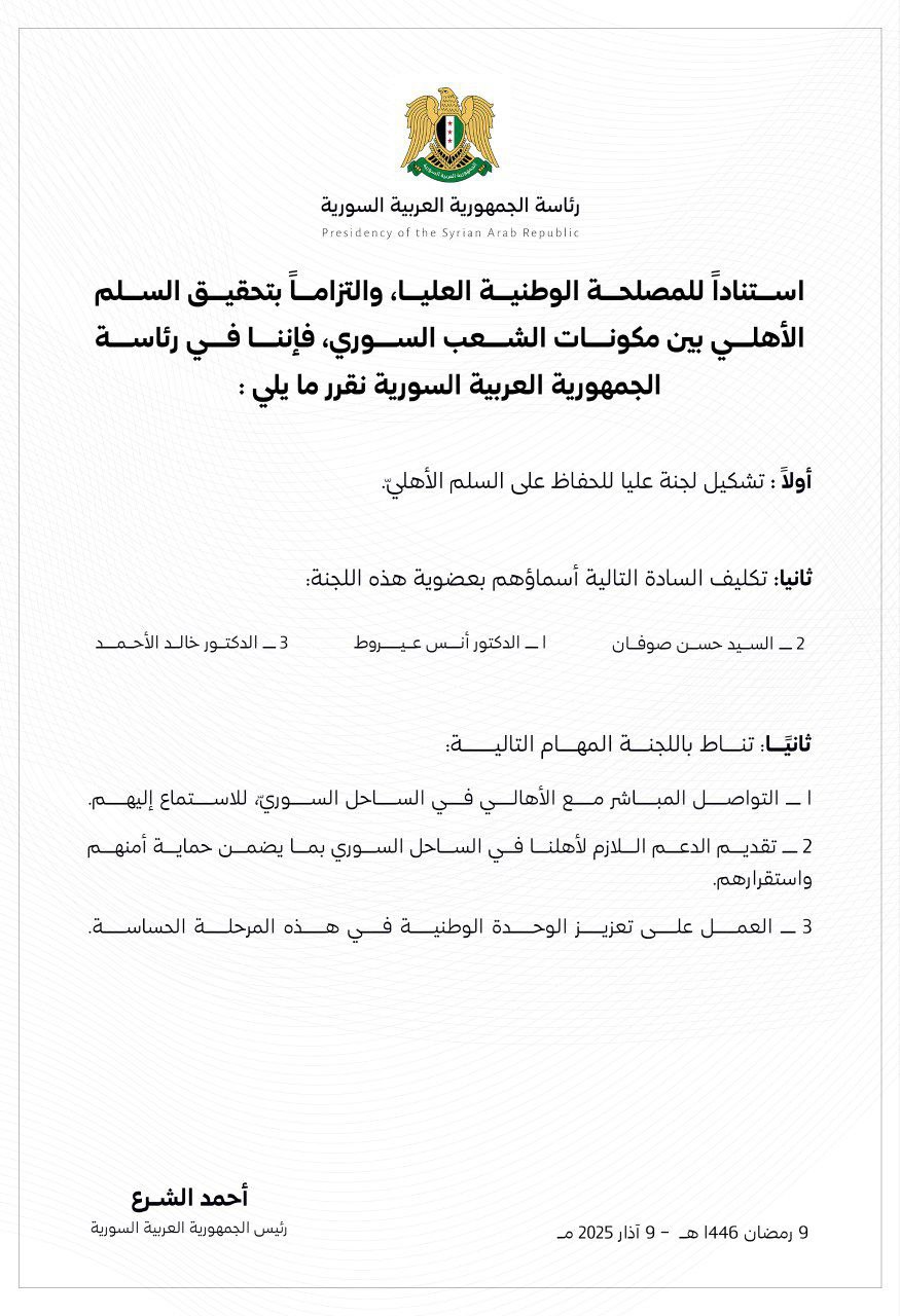 Based on the supreme national interest and the commitment to achieving civil peace among the components of the Syrian people, we, in the Presidency of the Syrian Arab Republic, decide the following: