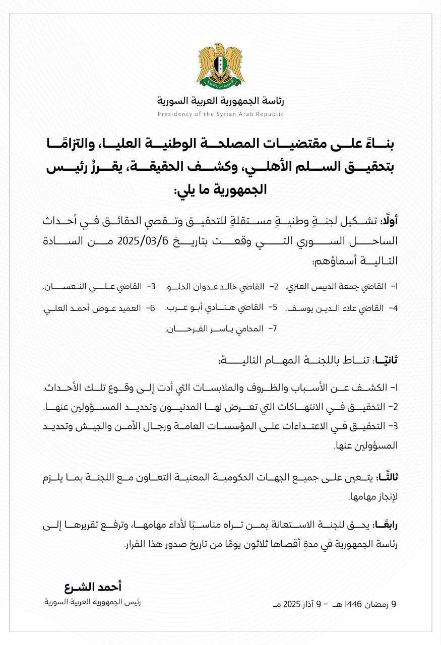 The formation of an independent national committee to investigate and fact-find regarding the events in the Syrian coast that took place on March the 6th , 2025.