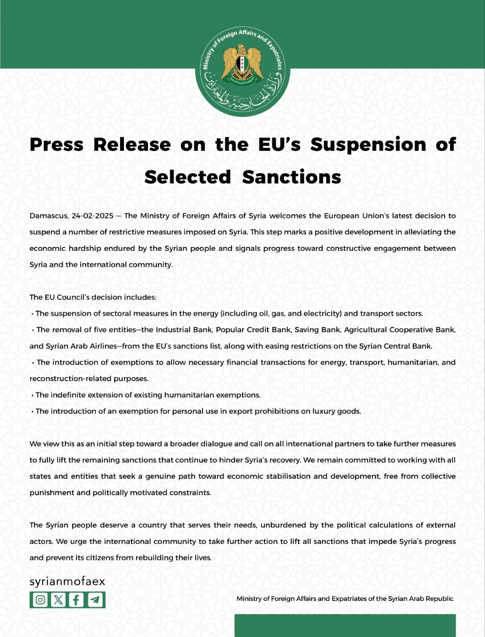 Press Release on the EU’s Suspension of Selected Sanctions Domestic Newsfeature On Feb 24, 2025 Share Press Release on the EU’s Suspension of Selected Sanctions Share FacebookTwitterWhatsAppEmail