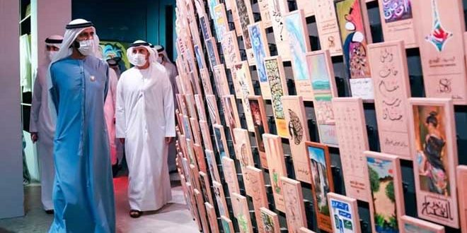Sheikh Al Maktoum toured sections of the pavilion and was briefed on the works of a group of Syrian artists and their exhibits of Syria’s brilliant history, the first alphabet, musical record and first poem of Ugarit kingdom.
