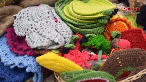 In the pavilion of the Charitable Construction Society, the supervisor of the exhibits, Maysa Raslan said: “The Society has three workshops for the production of clothes, embroideries and various woolen pieces woven by women registered in the society, as dozens of women benefit from the workshops, especially the breadwinners for their families.”