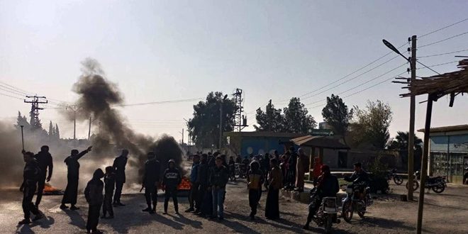 The residents of village closed the road linking Hasaka to al-Shaddadi and the Hasaka-Deir Ezzor-al-Kharafi highway with burning tires, amid a state of anger due to the aggressive practices of the SDF militia which serves the US occupation and implements its agenda in Syria, the sources said.