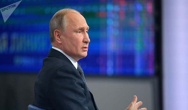Russian President Vladimir Putin addresses the nationwide audience during his annual Direct Line question and answer session, during the course of which he regularly manages to answer a multitude of questions flooding in by telephone, text, email, social media, or live via television studios.