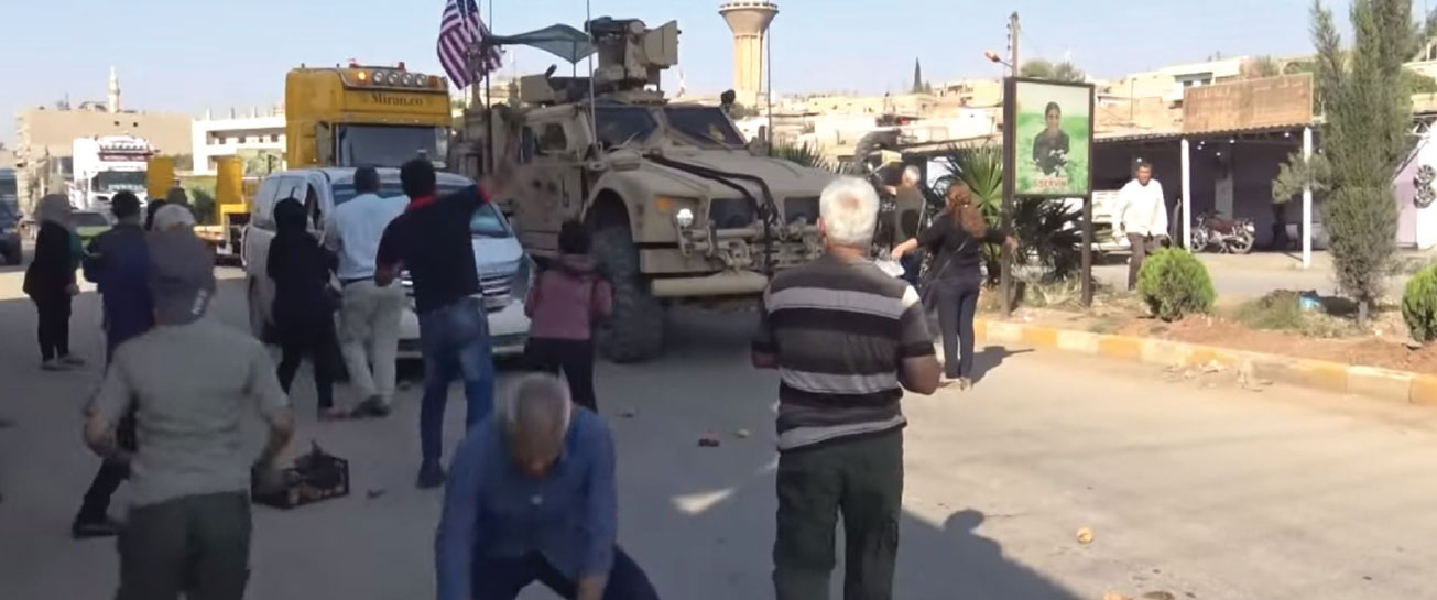Qameshli residents throw potatoes and stones at US occupation troops leaving Syria