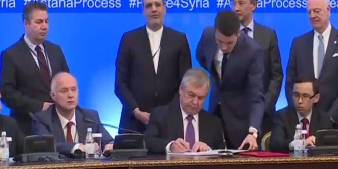 The document, which was signed on Thursday during the plenary session of Astana 4 meeting on the crisis in Syria, called for establishing de-escalation zones in the Syrian province of Idleb as well as in north of Homs, in eastern Ghouta of Damascus and in Syria’s southern area. The zones are to be set up by the guarantor countries and concerned parties with the purpose of putting an immediate end to fight activities, improve the humanitarian situation and prepare suitable environment for reaching political settlement to the crisis in Syria.