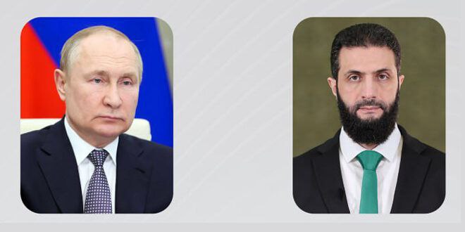 President Ahmad Al-Sharaa received a phone call from his Russian counterpart Vladimir Putin, during which President Putin congratulated President Al-Sharaa on assuming the presidency of the republic during the transitional period.