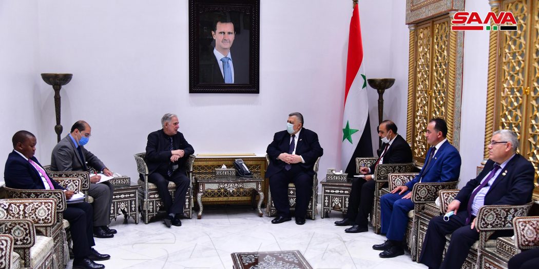 Damascus, (ST) – Speaker of the People’s Assembly Hammouda Sabbagh stressed, during his meeting on Wednesday,with the Ambassador of the Republic of South Africa in Damascus, Barry Philip Gilder, the need to enhance relations between the Assembly and the National Assembly in South Africa. He also affirmed on activating the mutual visits of parliamentary delegations in the interest of the two friendly countries and peoples.