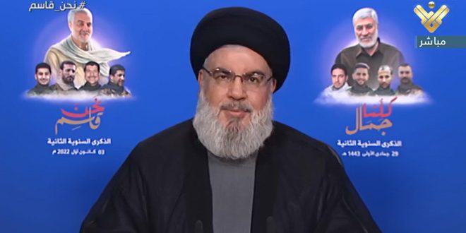 In a speech marking the second anniversary of the martyrdom of the two leaders, Soleimani and Al-Muhandis, Sayyed Nasrallah said: