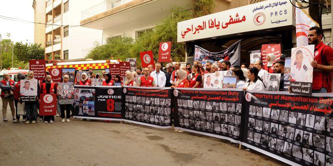 The Syrian Arab Red Crescent today participated in a solidarity vigil organized by the Palestinian Red Crescent in front of Yaffa Hospital in Damascus, in condemnation of the Israeli attacks against medical personnel in Gaza Strip.