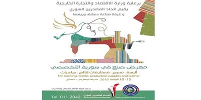 Damascus, (ST) – The Syrian Exporters’ Federation and the Damascus Chamber of Industry, in cooperation with the Ministry of Economy and Foreign Trade, will organize the “Specialized Made in Syria ” Exhibition for clothing, textiles, production supplies and leathers on February 15 to 18 on the Grounds of the City Fairs.