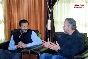 LATTAKIA- Lattakia Governor Amer Hilal and the Indian Charge d’ Affairs in Damascus Satender Kumar Yadav discussed during a meeting on Saturday enhancing cooperation in the fields of health, civil defense and rescue operations.