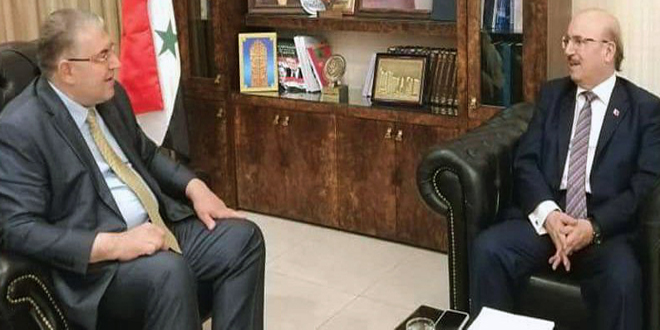 Damascus, (ST) -The Minister of Education Dr. DaremTabbaa and Ambassador Extraordinary and Plenipotentiary of the Kingdom of Bahrain to Syria, Waheed Mubarak Sayyar, discussed the importance of activating and developing relations in the field of education between the two countries.