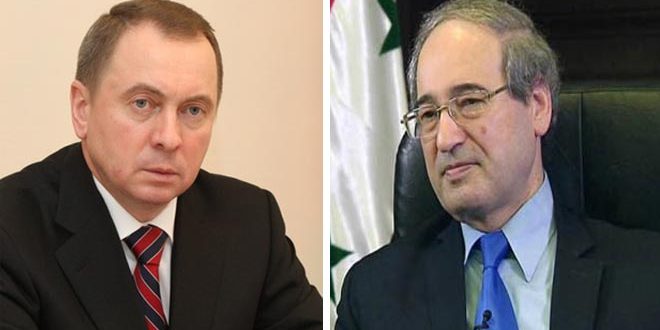 Minister of Foreign Affairs and Expatriates Faisal Al-Miqdad discussed on Tuesday with his Belarusian counterpart Vladimir Mackie the bilateral relations between the two countries in light of the common challenges facing them and the need to exert further efforts to develop these relations to the level that meets the Syrian and Belarusian peoples’ aspirations.