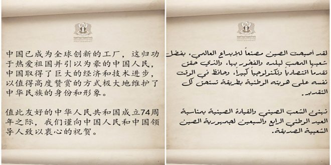 “China has become a factory of global creativity thanks to its people who love and are proud of their country, and have achieved great economic and technological progress. The Chinese people preserve their national identity in a way that deserves all appreciation. We congratulate the Chinese people and the Chinese leadership on the occasion of the 74th National Day of China,” the cable reads.