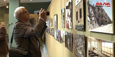 The exhibition, which was organized in cooperation with the Presidential Administration of the Donetsk People’s Republic, the Presidential Administration of the Lugansk People’s Republic and the Rossar Foundation, included paintings by Russian painters and children and photographs given by SANA documenting the scale of the destruction caused by the Terrorist organizations to hospitals, schools and economic infrastructure in Syria and also depicting the destruction, victims and suffering due to the war in the popular Republics of Donetsk and Lugansk.