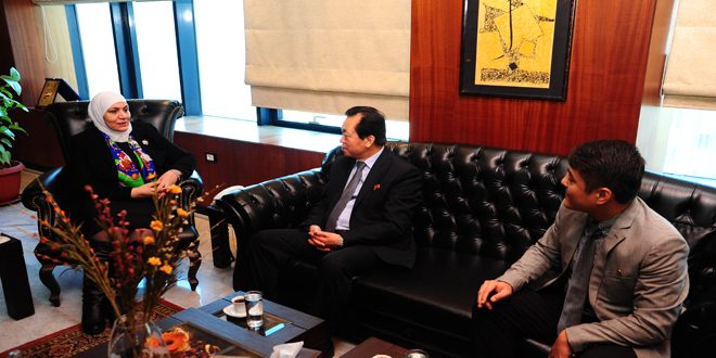 DAMASCUS– Minister of Social Affairs and Labor Rima al-Qadiri discussed on Wednesday with the Ambassador of the Democratic People’s Republic of Korea (DPRK) in Damascus Jang Myong Ho means to enhance bilateral relations, particularly in the reconstruction process, SANA reported.