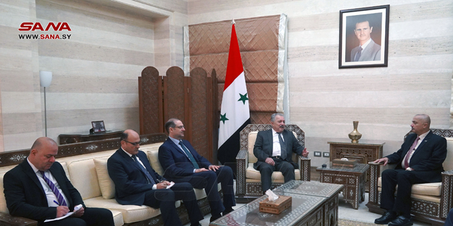 Damascus, (ST) – Prime Minister Hussein Arnous discussed on Monday with the Chargé d’Affaires of the Iraqi Embassy in Damascus, Yassin Sharif Al-Hujaimi means of developing bilateral relations in various fields, especially economic, industrial, commercial, transportation, product exchange, and bartering of goods needed by the markets of the two countries.