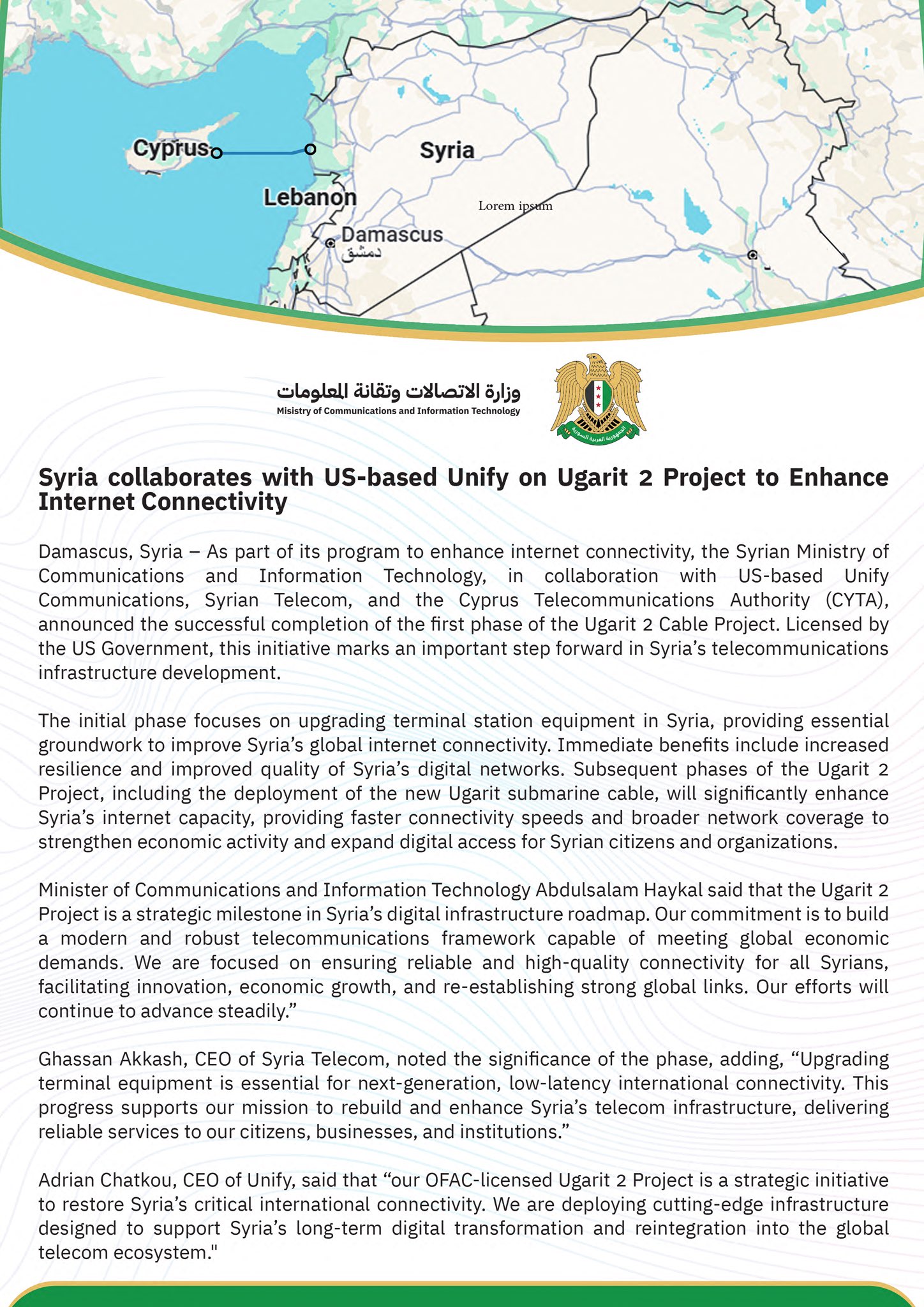 📌Under the supervision of President Ahmad Al-Sharaa, we launched, with the American company Unify, a project to upgrade the equipment of the old submarine cable (30 years old), which will double the internet capacity arriving in Syria in two months.