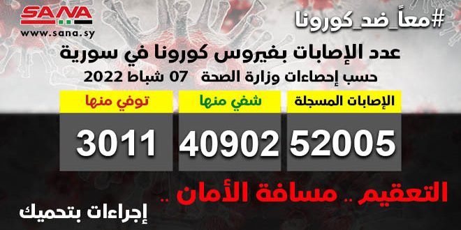 On February 7th, the Ministry of Health announced the registration of 90 new infections of coronavirus in Syria, the recovery of 329 cases, and the death of 3 cases of recorded cases of the virus.