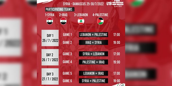The competitions of the Under-18 Men’s West Asian Basketball Championship will kick off on Monday with the participation of teams from Iraq, Palestine, Lebanon and Syria. The competitions will last until July 30th.